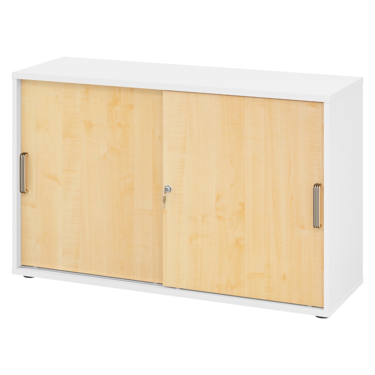 bümö Schiebetürenschrank 2OH - Aktenschrank abschließbar, Sideboard Schrank mit Schiebetüren in Weiß/Ahorn, Streifengriff - Büroschrank aus Holz mit