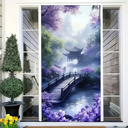Banner per porta da giardino zen 3D per la stagione primaverile, padiglione giapponese e vista sul ponte ad arco, fiori viola appesi, banner per porta per l'arredamento della casa in veranda