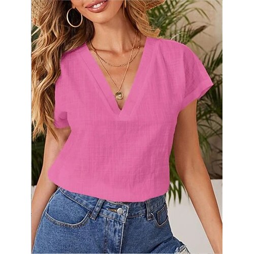 T-Shirt in Lino Falso per Donna Colore Solido Moda Stile Classico Maniche Corte V Collo Top Regolari Giornalieri Weekend Blu Nero Bianco Giallo Rosa Estate Primavera