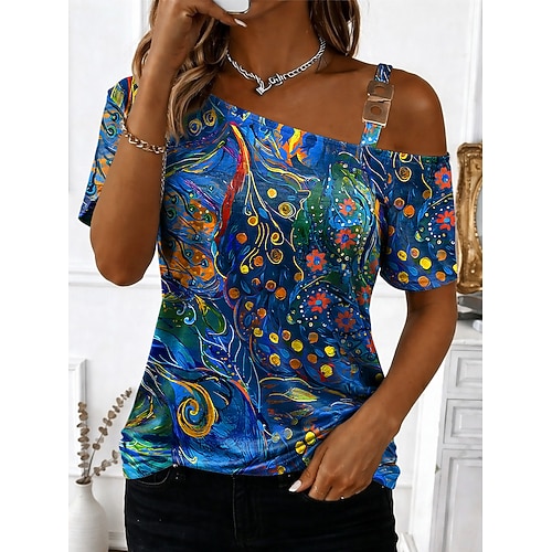 Per donna Maglietta Stampato Asimmetrico Grafico Astratto Vintage Moda Elegante Manica Corta Monospalla Senza Spalle Collo asimmetrico Top Regolari Quotidiano Uscire Weekend Blu Fucsia Estate