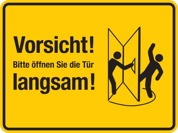 Türschild, Bitte öffnen Sie die Tür langsam!, links, gelb, 150 x 200 mm - 200x150 mm Folie selbstklebend