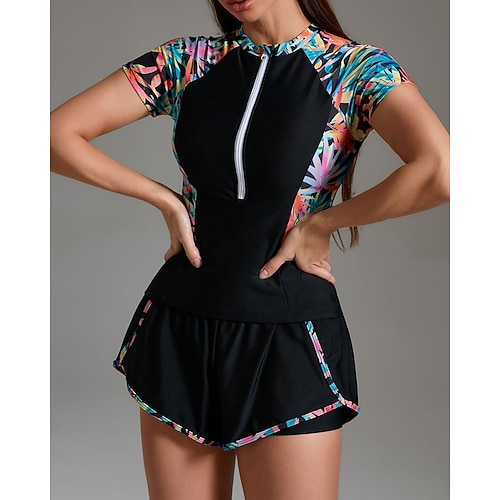 Per donna Top sottomuta Costume da bagno 2 pezzi Stampato Ultra Leggero (UL) Protezione UV Elastico Manica Corta Costume da Bagno Con zip Surf Snorkeling Estate