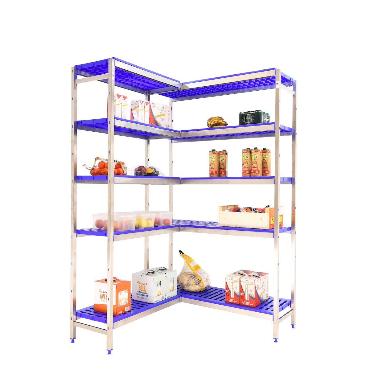 Simoninox Edelstahl-Eckregal 5 Fachböden aus Polypropilen 1600x1760x500 mm (Höhe x Länge x Breite)