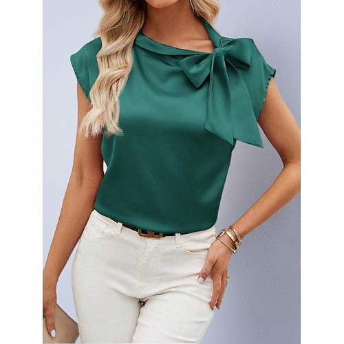 Per donna Camicia Camicia in raso Blusa Semplice Elegante Essenziale Classico Manica Corta Cravatta al collo Top Regolari Quotidiano Ferie Uscire Giallo Verde chiaro Blu Reale Viola Arancione Estate