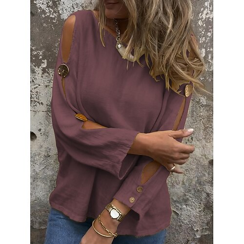 Blusa in Lino Sintetico Simile al Cotone per Donna Bottoni Colore Solido Elegante Casual Manica Lunga Collo Rotondo Top Quotidiani Neri Giallo Viola Khaki Estate Primavera Autunno
