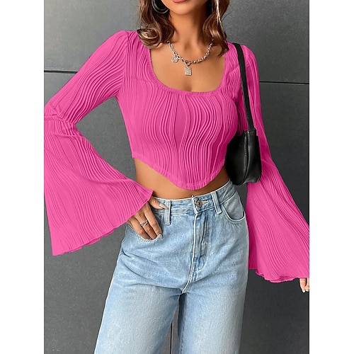 Per donna Blusa Tinta unica Elegante Casual Manica Lunga Collo a U Top corti Abbigliamento casual alla moda Ferie Uscire Nero Bianco Fucsia Primavera Autunno