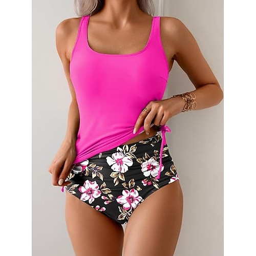 Costume da bagno tankini da donna 2 pezzi arricciato vita alta controllo pancia vita alta Slim senza schiena per vacanze al mare floreale scollo a U senza maniche