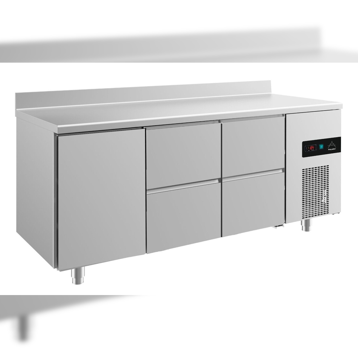 Gastro Edelstahl Kühltisch 1 Tür(links) je 2 Schubladen rechts&mittig Aufkantung, 1865x700x850mm -2/+8°C