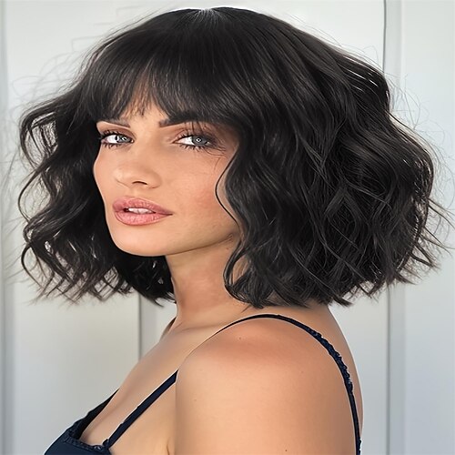 parrucche marrone scuro per le donne parrucca bob corta ondulata con frangia per le donne parrucche sintetiche a onde corte ricce parrucche per capelli in fibra resistente al calore per tutti i giorni