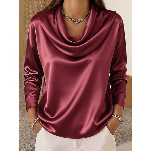 Per donna Camicia in raso Camicia elegante Blusa Arricciato Tinta unica Elegante Essenziale Casual Manica Lunga Scollo a Cascata Top Regolari Quotidiano Feste Blu Giallo Rosso Viola Primavera Autunno