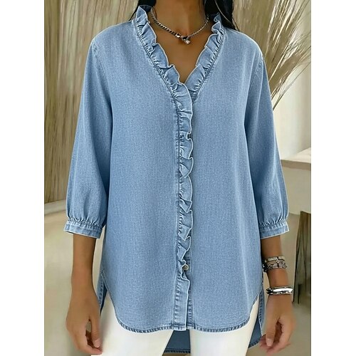 Per donna Camicia Estiva Camicia casual Blusa Volant Tinta unica Vacanza Vintage Elegante Manica 3/4 Scollo a V Top Regolari Quotidiano All'aperto Ferie Blu Nero Blu marino Albicocca Grigio Primavera