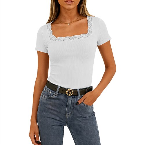 Per donna Maglietta Top estivi Pizzo Patchwork Semplice Elegante Moda Classico Manica Corta Collo quadrato Top Regolari Quotidiano Uscire Weekend Blu Bianco Rosa Rosso Cachi Estate Primavera