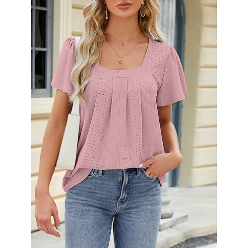 Per donna Blusa Traforato Tinta unica Elegante Casual Manica Corta Collo quadrato Top Regolari Quotidiano Nero Rosa Vino Viola Fucsia Estate Primavera