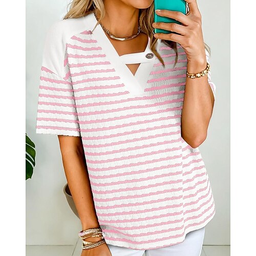 maglietta da donna a righe classica casual manica corta scollo a V top normali tutti i giorni per uscire fine settimana patchwork blu nero rosa rosso estate primavera