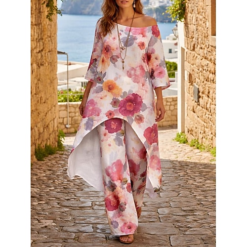 Per donna Set da due pezzi Set di Pantaloni Bolero Top Manica Lunga Girocollo Floreale Grafico Bohemien Moda Streetwear Casuale Quotidiano All'aperto Bianco Rosa Blu Reale Primavera Vestibilità comoda