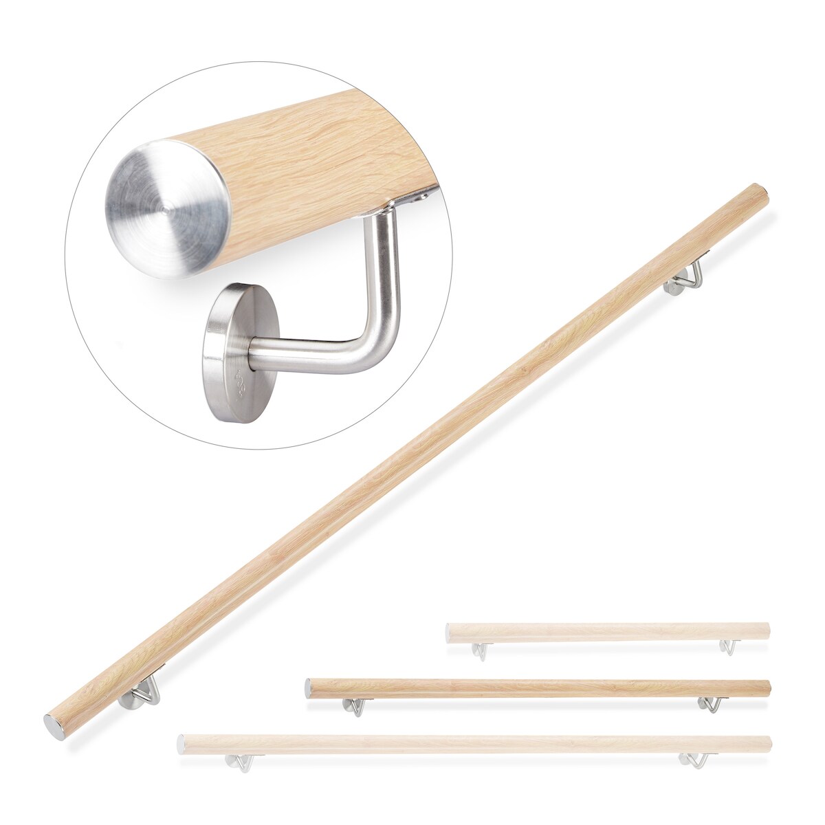 Relaxdays Handlauf Aluminium, rund, Treppengeländer innen, außen, Buche-Optik, 150 cm, Ø 42mm, mit Wandhalterung, natur