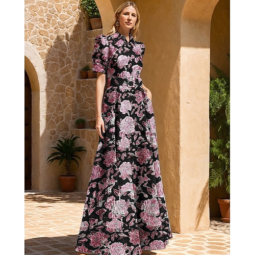 Abito lungo da ballo A-Line abito formale stile celebrità con maniche corte colletto e stampa floreale