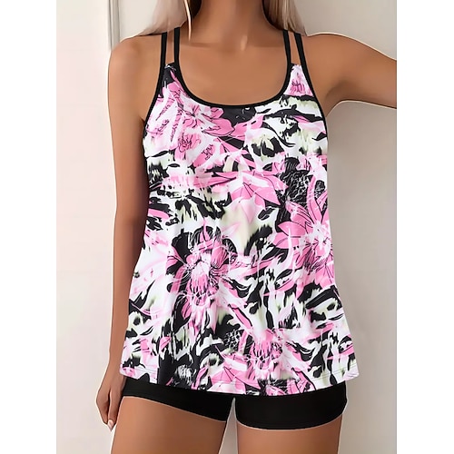 Costume da Bagno Due Pezzi da Donna Tankini Arricciato Slip Controllo Pancia Alta Vita Slim Senza Schienale Vacanza Spiaggia Fiori Grafica U Collo Senza Maniche