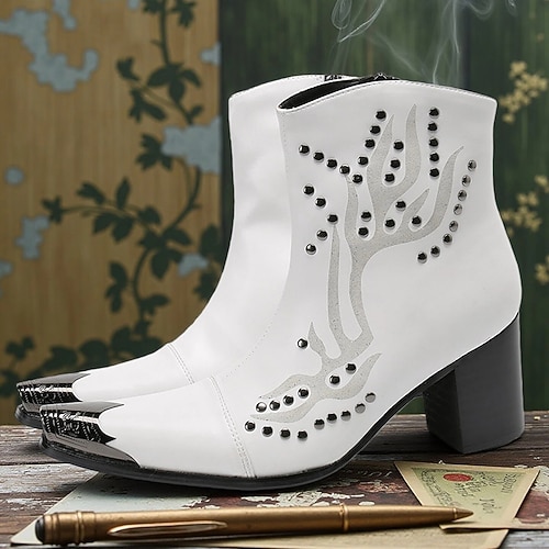 stivaletti da uomo in vera pelle bianca con motivo ad albero borchiato: calzature alla moda per feste, serate fuori e occasioni speciali