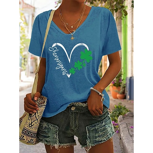 T-shirt da donna con motivo grafico a trifoglio, stile vintage, classica, manica corta, scollo a V, regular, stampa quotidiana, blu, nero, verde, grigio, estate, primavera