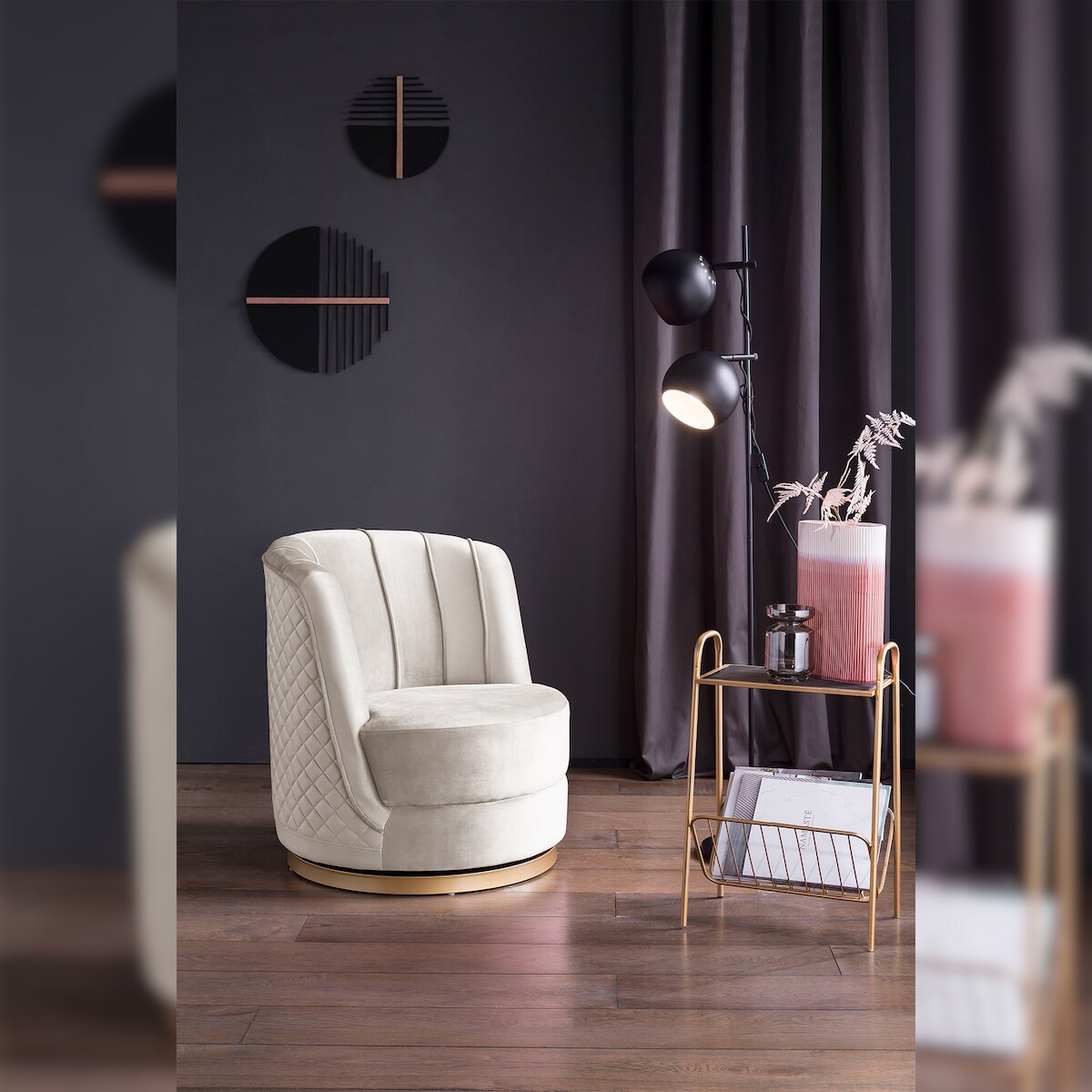 SalesFever Dreh-Sessel | 360° drehbar | mit Diamantsteppung | Bezug Samt | Sockel Metall | B 68 x T 57 x H 77 cm | beige – goldfarben