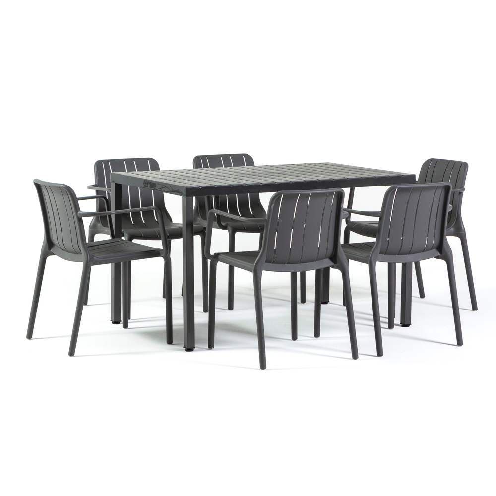 RATTATAN Garten-Ess-Set, rechteckiger Tisch 130x80 cm und 6 Stühle mit Armlehnen, modern, widerstandsfähig, für Terrassen, Gärten - Zeno + Ginny - Grau
