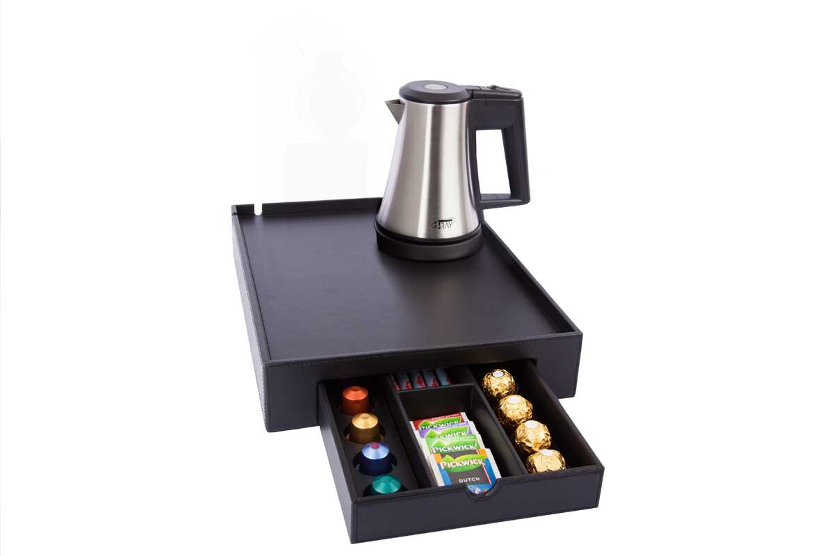 Willkommenstablett SPACE aus Kunstleder Schwarz mit STAR Wasserkocher 0,5 L Edelstahl B-Tray Begrüßungstablett Kaffeetablett Teestation Kaffeestation