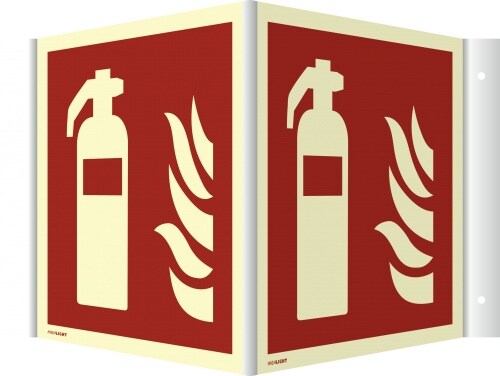 Winkelschild Feuerlöscher ISO 7010, Alu, nachleucht., 160-mcd, 300x300 mm