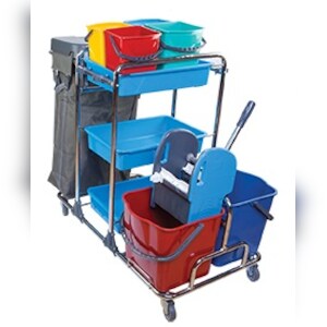 CleanSv Deluxia Master chrom Reinigungswagne / Servicewagen, ein Putzwagen mit 2 x 17 Liter Eimer, 4 x 5 Liter Eimer, 3 PE Ablagen, Mopppresse und
