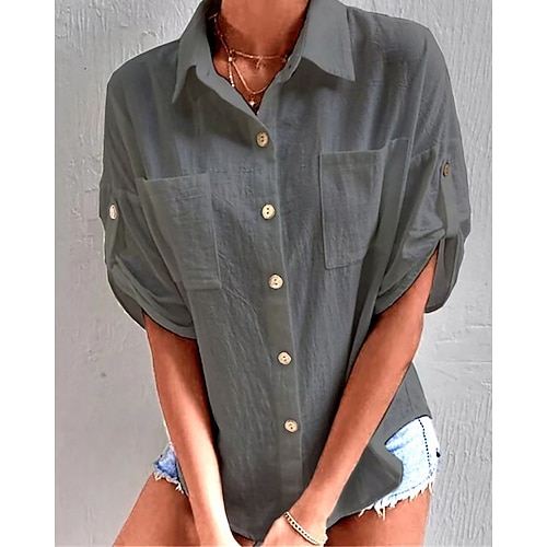 Per donna Camicie di cotone e lino Blusa Semplice Elegante Vintage Mezza Manica Colletto a Camicia Top Regolari Quotidiano Ferie Uscire Tasca Bottoni Nero Bianco Grigio Estate Primavera