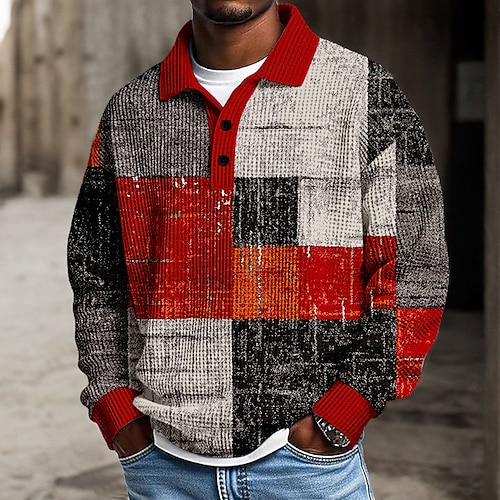 Per uomo Geometrico Polo Manica Lunga Magliette polo Bavero Casual All'aperto Streetwear Athleisure Abbigliamento quotidiano Stampa 3D Bottoni Primavera Autunno Inverno Rosso Blu