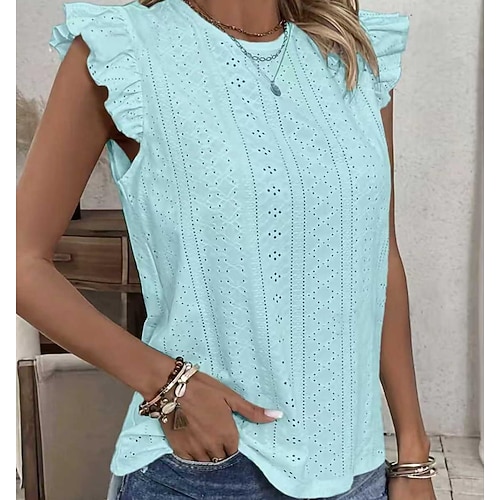 Per donna T-shirt con ricamo a occhielli Volant Taglio Asta Tinta unica Elegante Vintage Casual Manica Corta Ad aletta Girocollo Top Regolari Quotidiano Uscire Bianco Rosa Vino Azzurro Estate