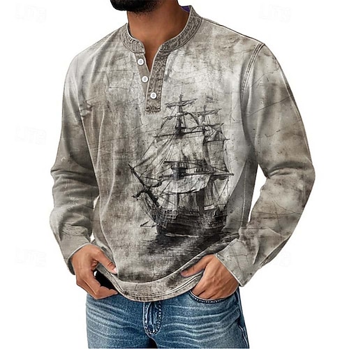 Per uomo Grafico Barca a vela Maglia Henley Maglietta Manica Lunga Vintage Moda Carino Casuale Ferie Uscire Primavera Primavera Autunno Blu chiaro Viola Marrone Grigio Colletto Henley Henley