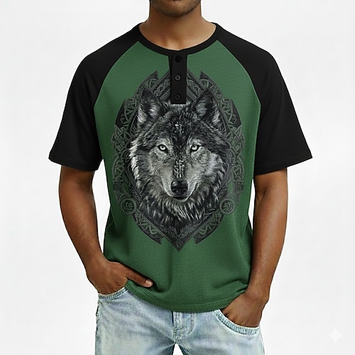 Per uomo Grafico Lupo Vichingo Maglia Henley Manica Corta Moda Designer Retrò Vintage Quotidiano All'aperto Primavera Estate Tutte le stagioni Blu scuro Verde scuro Grigio Henley Maglietta Henley