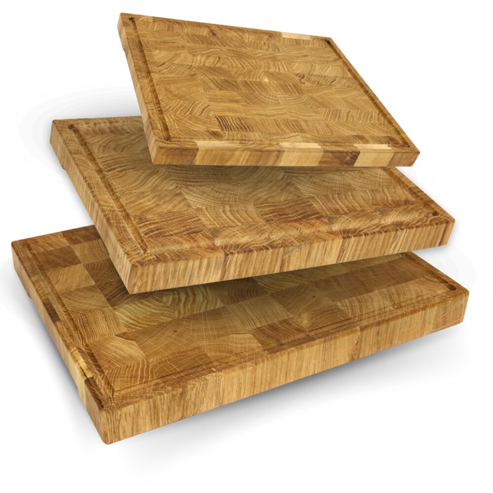DELUKE® Schneidebrett Holz Set MILA [KLINGENSCHONEND] - 3 Größen, Stirnholz Eiche, inkl. Saftrille | Holzbrett Küchenbrett