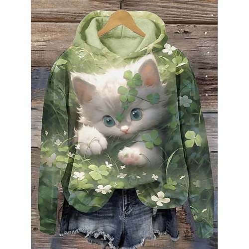 Per donna Felpa con cappuccio Grafico Animale Gatto Casual Manica Lunga Scollo a V Con Cappuccio Top Regolari Casuale Abbigliamento da sera Streetwear Verde primavera Verde scuro Verde Primavera