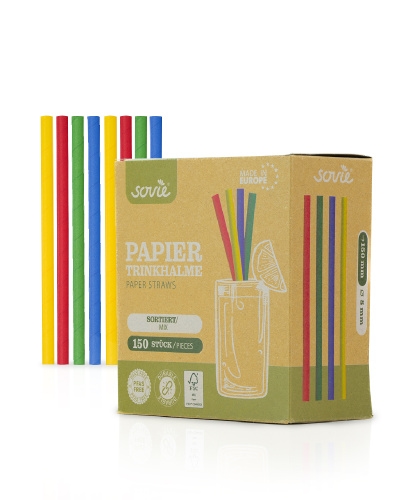 Sovie Trinkhalm in Blau Gelb Grün Rot farbig sortiert aus Papier, Ø 8 mm / 15 cm, 150 Stück in Pappkarton