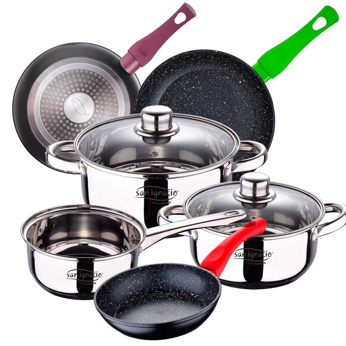 San Ignacio - Cassel 16/18/20 cm Edelstahl-Kochgeschirrset mit 18/22/26 cm Jolie-Pfannenset aus geschmiedetem Aluminium