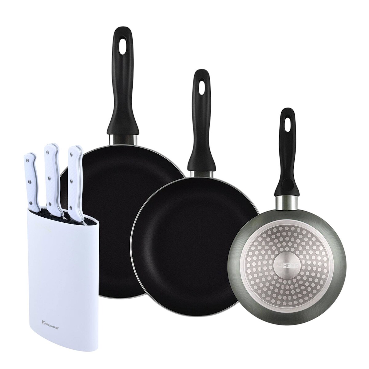 BERGNER - Set aus 3 Pfannen Ø16/20/24cm aus gepresstem Aluminium in metallic-grau mit 3-teiliges Messer-Set mit Messerblock aus Edelstahl