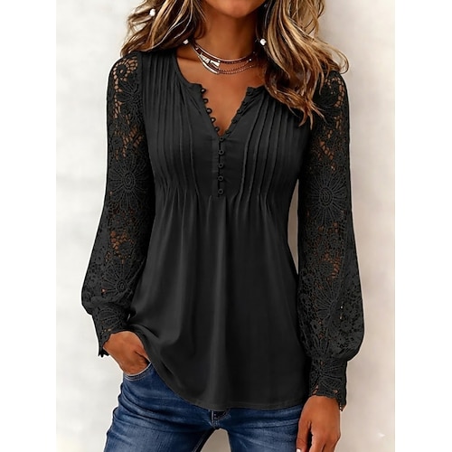 Per donna Blusa Tinta unica Elegante Casual Manica Lunga Scollo a V Top Regolari Quotidiano Pizzo Patchwork Bottoni Blu Nero Bianco Rosso Viola Primavera Autunno