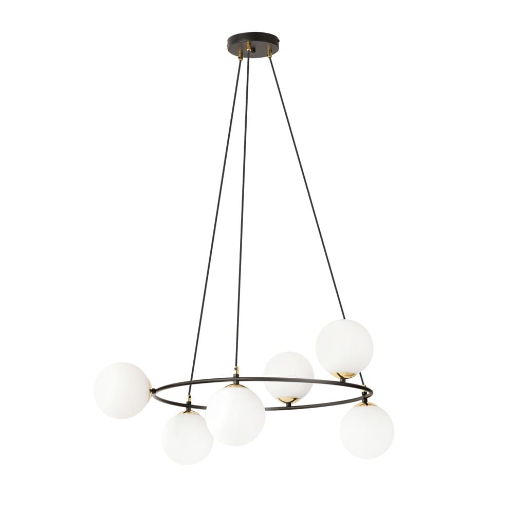 Lampada a sospensione con struttura ad anelli e 6 sfere in vetro