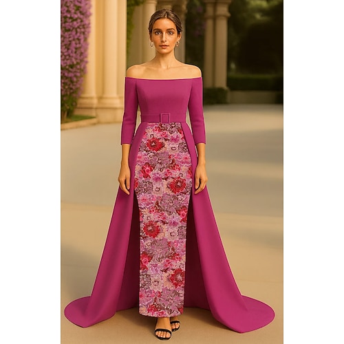 Linea ad A Strascico a Terra Perline ricamate Abito Formale Abito da madre della sposa Abito da Sera Abito da ballo con sopragonna Abito formale Elegante Scintillante Manica 3/4 Senza Spalle Festa in