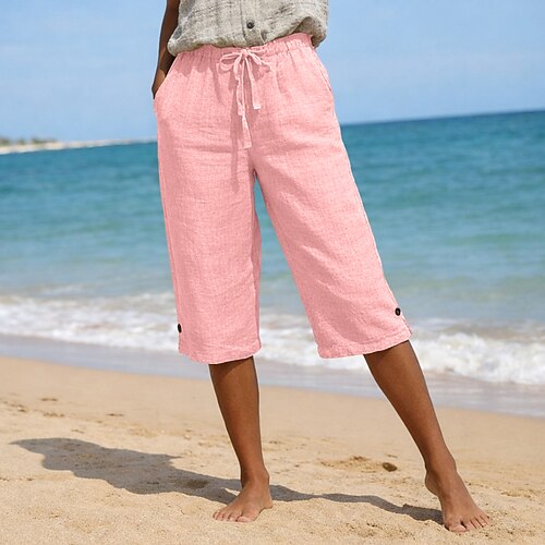 Pantaloni Capri in Cotone e Lino per Donna Pantaloni da Spiaggia Pantaloni Vacanza Casual Quotidiana Lunghezza Polpaccio Vita Alta Colore Unito Con Stringa Tasca Comfort Leggero Traspirante