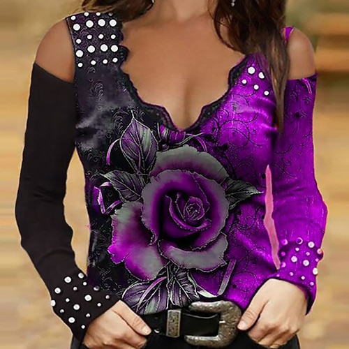 Per donna Blusa Tinta unica Elegante Casual Manica Lunga Scollo a V Top Regolari Quotidiano Patchwork Ricamato Nero Bianco Rosa Viola Verde Primavera Autunno Inverno