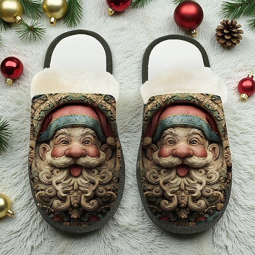 pantofole vintage da uomo a forma di Babbo Natale: calde scarpe da interno foderate in peluche con classica stampa natalizia, comode calzature invernali per la casa e regali per le feste