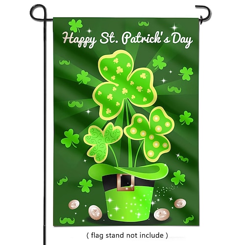 bandiera da giardino con trifoglio per San Patrizio, disegno di folletto, verde Decorazione irlandese dorata, bandiera da giardino per la celebrazione di San Patrizio.