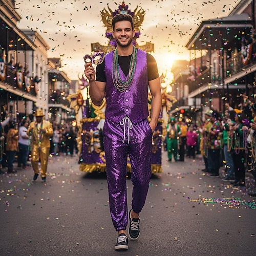 Costume di Carnevale 2026 Disco Carnevale Gilet Jogger Costume Cosplay Paillettes Adulti Per uomo Carnevale martedì grasso Giorno di San Patrizio Club Feste Performance Costume di Carnevale facile
