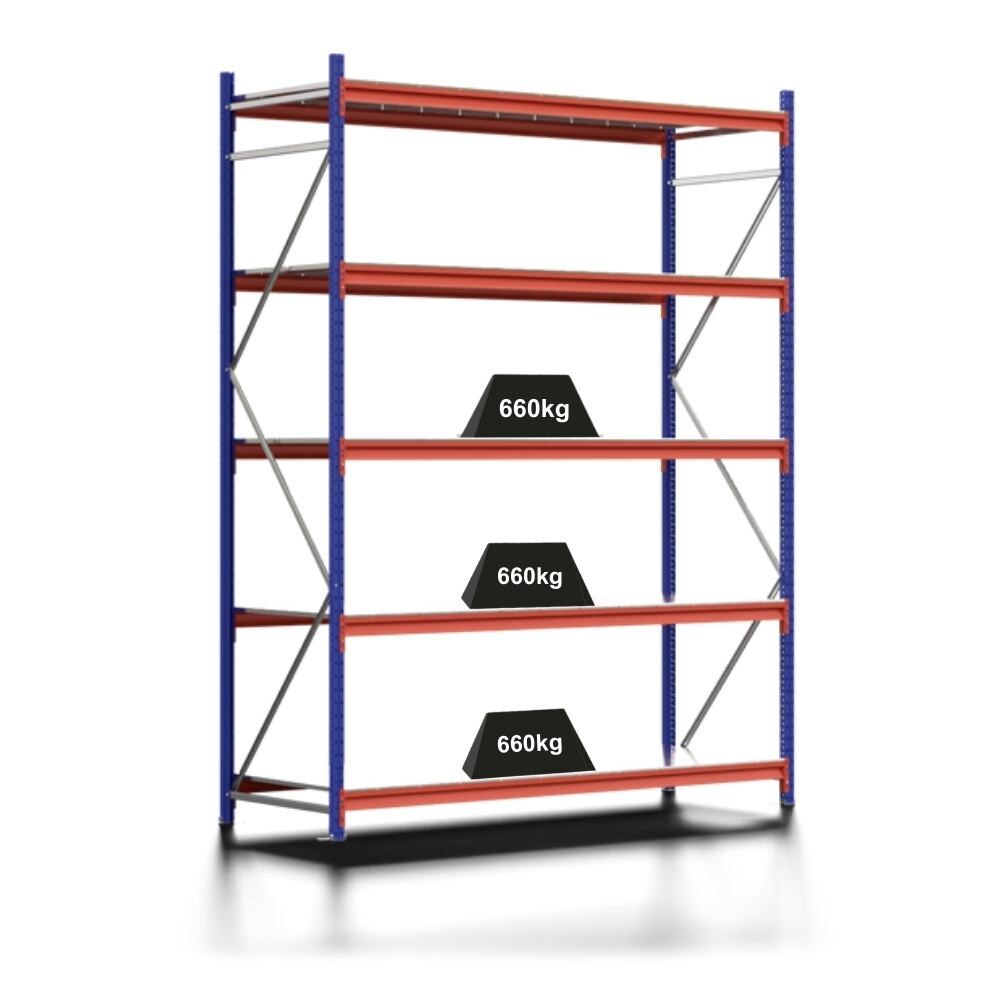 PROREGAL Weitspannregal MOOSE Stecksystem Omega-Profil, Grundregal, HxBxT 300x222x80cm, 5 Ebenen, Spanplatten-Fachboden, Fachlast 660kg, Blau/Orange