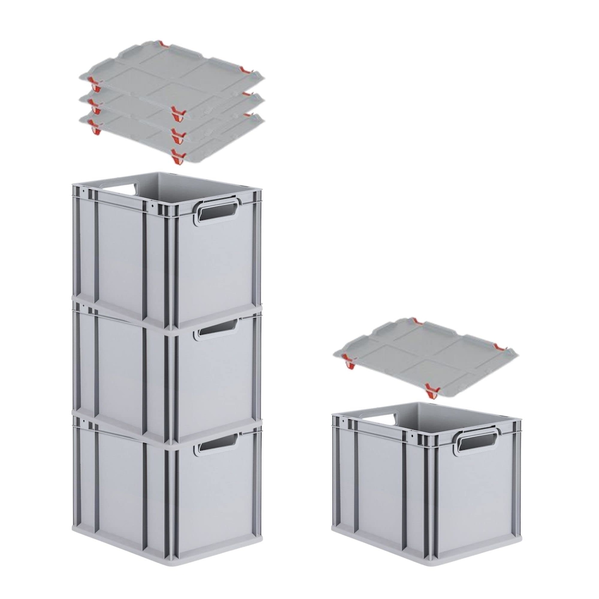 PROREGAL SuperSparSet 4x Eurobox NextGen Economy mit Auflagedeckel & 4x Verschlüsse Rot, Griffe offen, HxBxT 32x30x40cm, 30L, Eurobehälter, Box