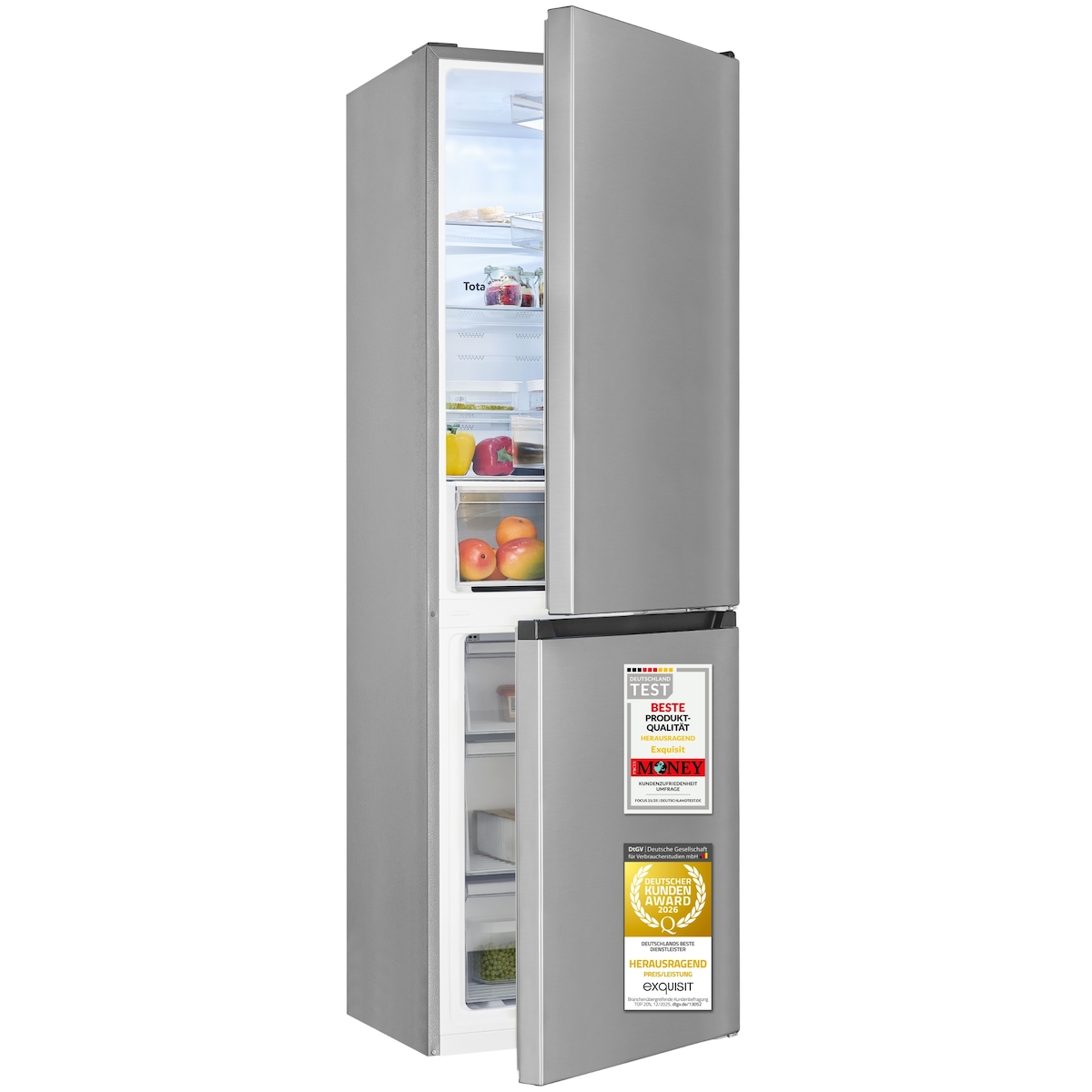 Exquisit Kühl-Gefrierkombination, 304 Liter, NoFrost, 4-Sterne-Gefrierfach, LED-Beleuchtung, KGC320-100-NF-010A inoxlook